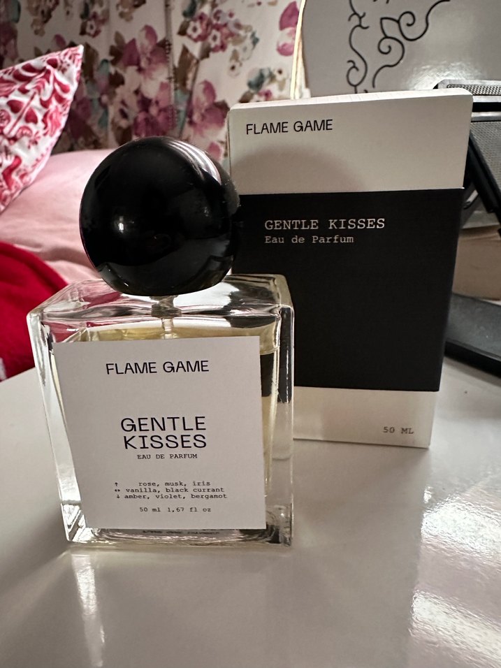 Flame Game Gentle Kisses Eau de Parfum, gül, misk, iris, vanilya, siyah frenk üzümü ve beyaz bergamot notalarına sahip 50 ml şişede sunulur. Temiz ve pudralı bir kokudur. Kalıcılığı çok yüksek. Görsellerdeki gibi az miktarda kullanılmıştır. Bu ürünün stokları flame game in kendisinde tükenmiş olup serinin diğer bir üyesini son görselde güncel fiyatını görmeniz için ekledim. Alacak kişiye şimdiden hayırlı olsun