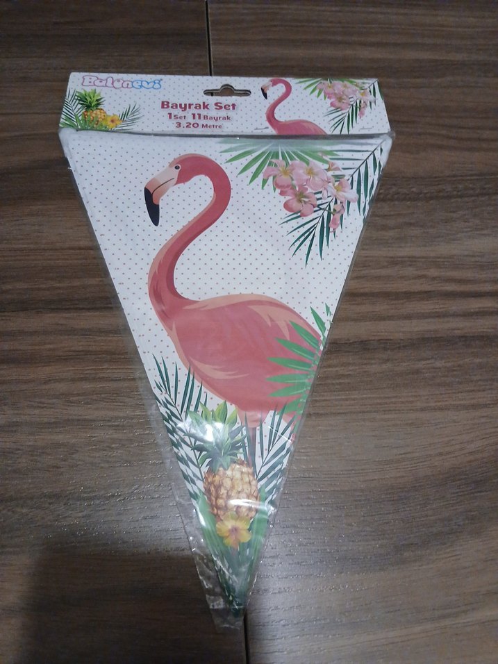 Pembe flamingo ve tropikal bitki desenleriyle renkli parti bayrak seti, 3.20 metre uzunluğundadır.