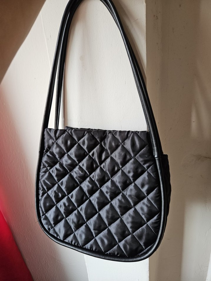Bu kadın çantası, siyah paraşüt kumaşı ve kapitone tasarımı ile ince omuz askısına sahip, minimalist ve gotik stil sunar. Kullanılmamıştır.