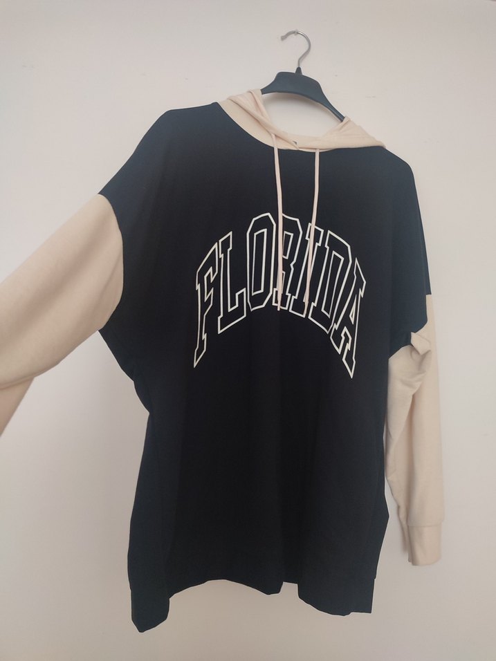 Bol kesim, uzun kollu, kapüşonlu ve fermuarlı kadın sweatshirtü. Önünde 'FLORIDA' baskısı bulunur. Bej kollu ve kapüşonlu, yumuşak fleece kumaştan yapılmıştır. ürün 1 kere giyildi yalnızca temiz defosuz