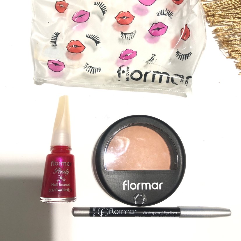Flormar baked powder 31 medium deep + canlı pembe renkli oje + waterproof 108 eyeliner Dudak ve kirpik desenli şeffaf bir çanta ile birlikte gelir.