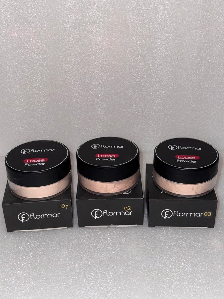 Flormar 01 numara açık bej tonunda, siyah kapaklı küçük kavanozda gevşek pudra. Pürüzsüz bir görünüm sağlar.