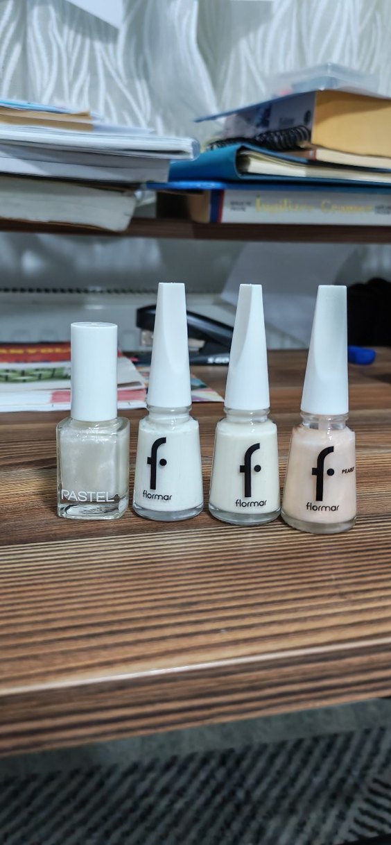 Pastel ve Flormar markalarından dört adet açık beyaz tırnak ojesi seti, pürüzsüz ve zarif kaplama sağlar. iki sedefli iki normal kodları görselde