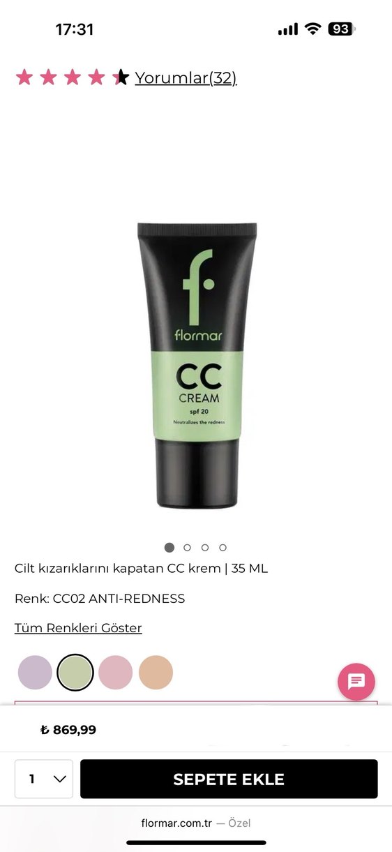 Flormar CC krem, 35 ML tüpte, cilt kızarıklıklarını nötralize eden spf 20 koruması ile khaki pastel renktedir.