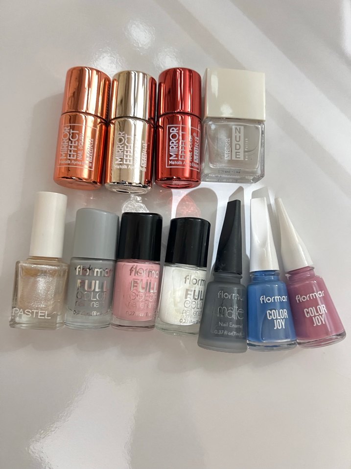 Flormar markasına ait metalik, nude ve pastel tonlarda çeşitli açık ve canlı renklerde oje seti. Renkli tırnaklar için ideal.