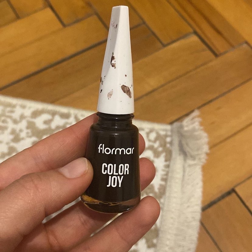 Flormar Color Joy serisi koyu kahverengi ojede yoğun renk ve kolay uygulama sunar. Beyaz kapak üzerinde boya izleri bulunur.