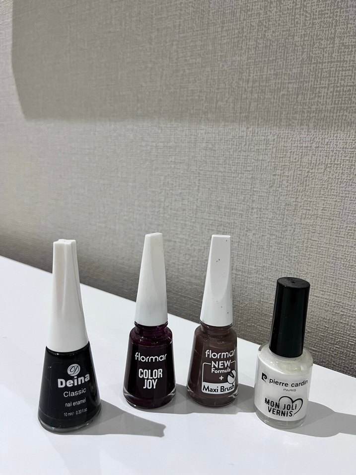 Deina, Flormar Color Joy, Flormar New Feeling ve Pierre Cardin markalarından koyu ve beyaz renk ojeler. Uzun saplı kapaklarıyla kolay sürüm sağlar.