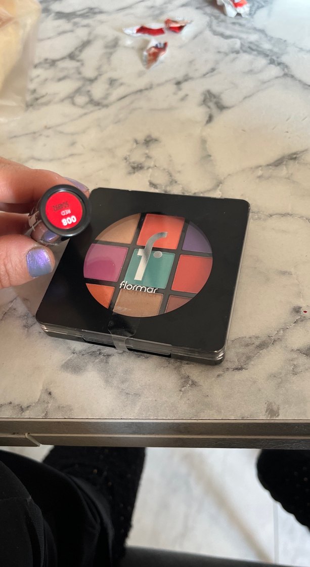 Flormar marka, canlı koyu kırmızı ve uyumlu tonlardan oluşan göz farı paleti ve uyumlu ruj.