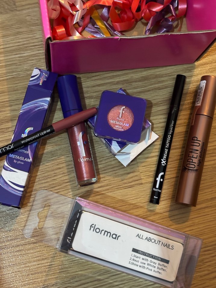 Flormar marka gloss, eye liner, maskara dudak kalemi far ve tırnak parlatıcısı içeren makyaj seti.