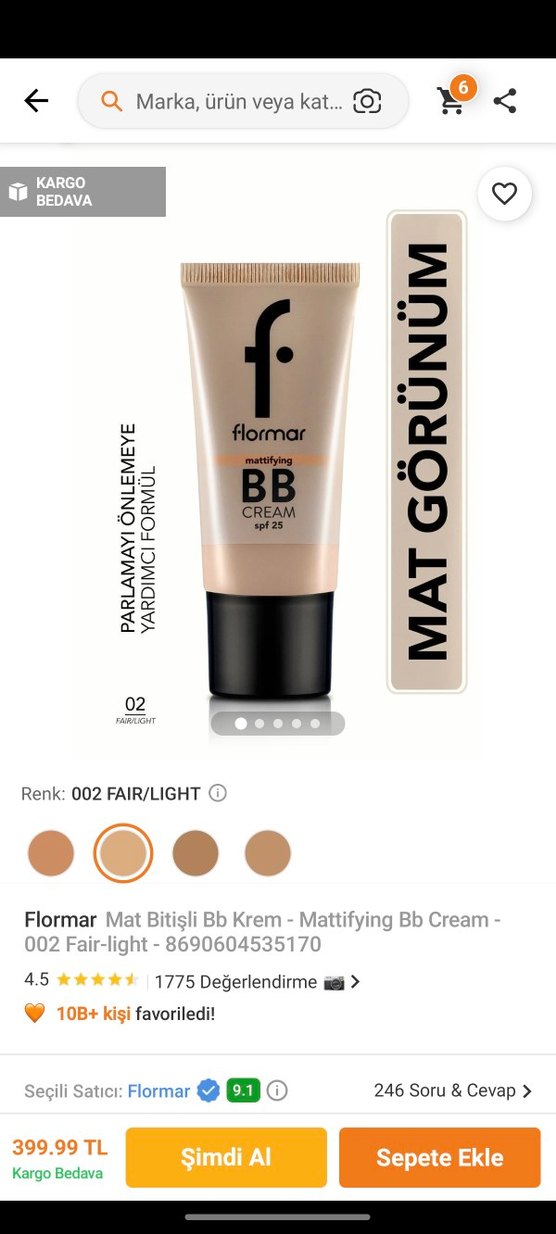Flormar Mat Bitişli BB Krem 002 Fair-Light, SPF 25 koruması ile parlama önleyici ve mat görünüm sağlar. Açık bej tonları için uygundur.