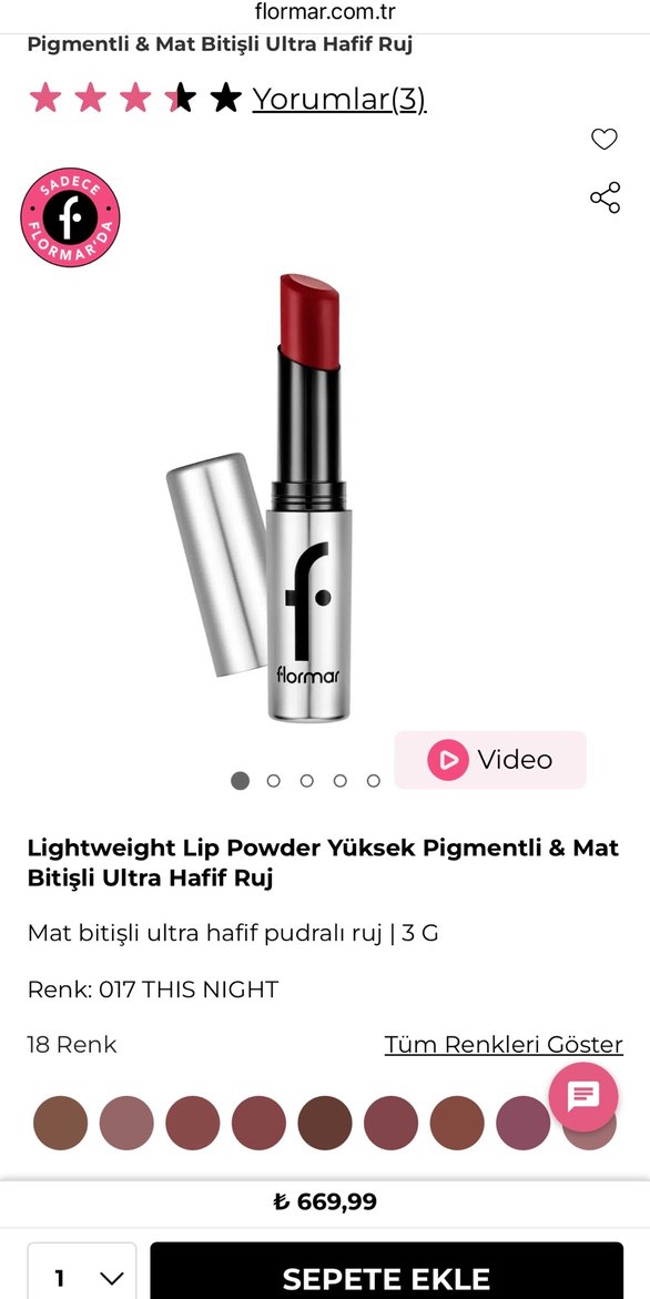 Flormar mat bitişli ultra hafif pudralı ruj, 017 THIS NIGHT renginde yüksek pigmentlidir.