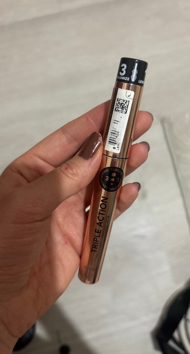 Bej renkli, parlak bitişli maskara, kirpikleri hacimlendiren, uzatan ve kıvıran üçlü etkili formüle sahiptir.