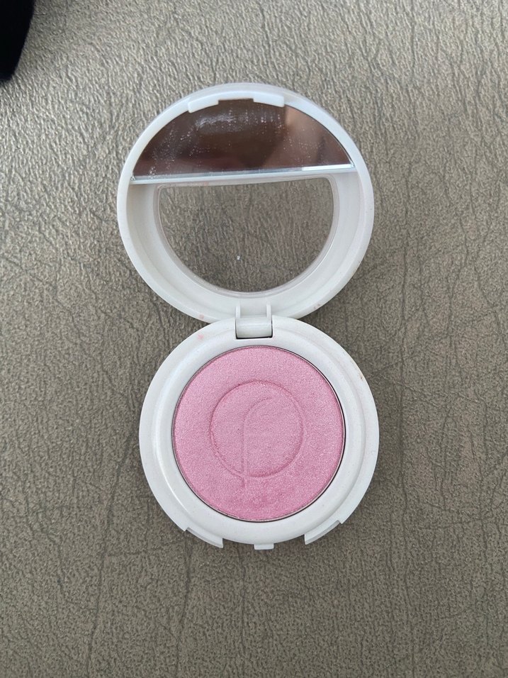 Pastel pembe tonlarında, kompakt kutuda ve aynalı allık.