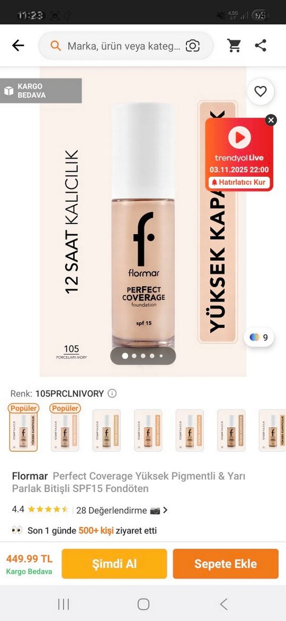 Flormar yüksek pigmentli ve yarı parlak bitişli fondöten, SPF15 koruma sağlar ve 12 saat kalıcılıktadır. Renk: 105 Ivory. sıfır paketli