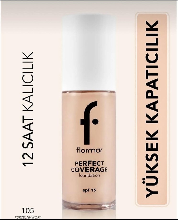 Flormar Perfect Coverage fondöten 105 Porcelain Ivory, yüksek kapatıcılık sağlar ve 12 saate kadar dayanır. SPF 15 içerir.