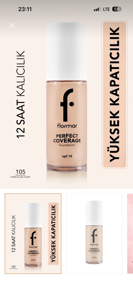 Flormar Perfect Coverage fondöten 105 Porcelain Ivory, yüksek kapatıcılık ve 12 saat kalıcılık sağlar, SPF 15 korumalıdır.