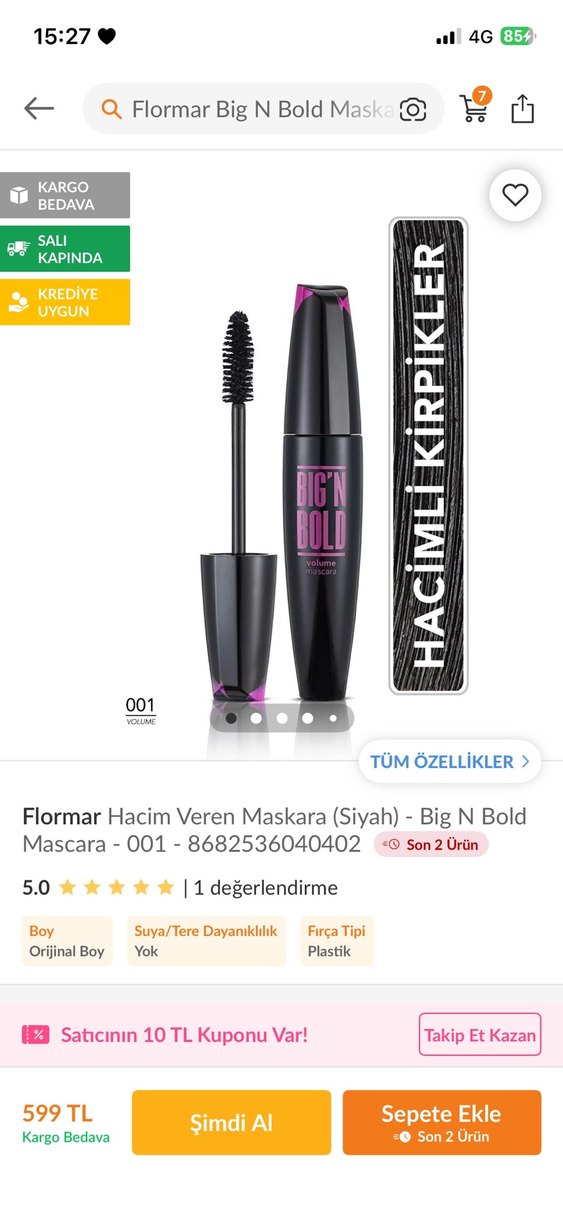 Flormar Big N Bold siyah maskara, plastik fırça ile hacim sağlar. Elimde kapalı 3 adet vardır güncel fiyatı trendyolda bellidir
