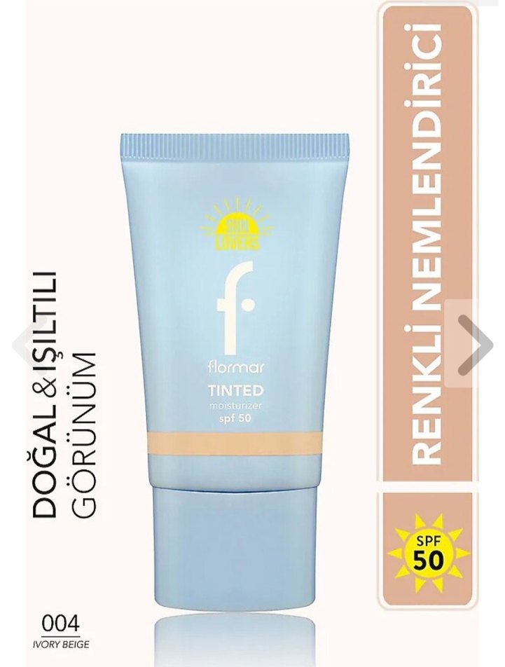 Flormar 004 Ivory Beige renkli nemlendirici, SPF 50 koruma ve doğal ışıltılı görünüm sağlar.