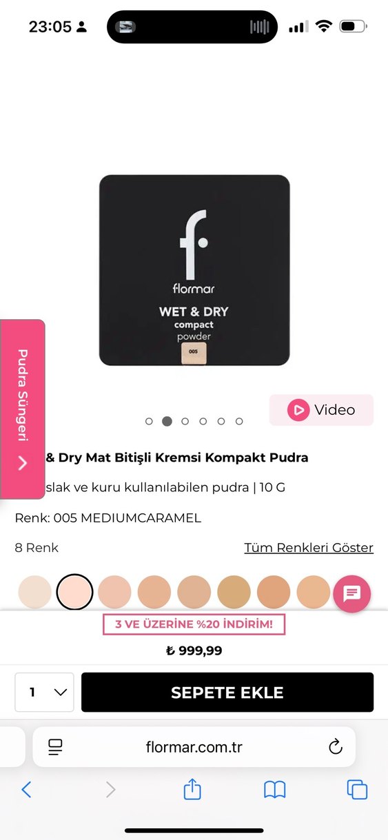Flormar Wet & Dry kremsi kompakt pudra, mat ve kremsi bitiş sağlar. Islak ve kuru kullanılabilir. 8 renk seçeneği, 005 Medium Caramel dahil. Pudra süngeri ile birlikte gelir.