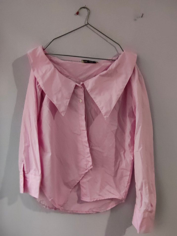 Geniş yakalı, düğmeli önü ve uzun kollu pembe keten gömlek, rahat kesim. Günlük sokak tarzı için uygundur.