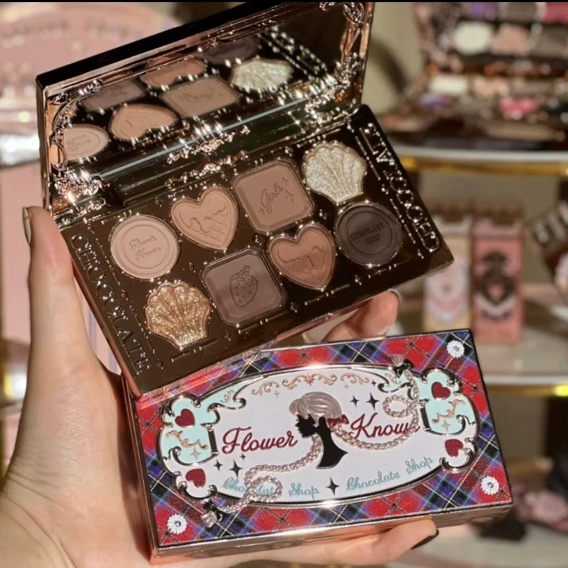 Flower Knoww göz farı paleti, kalp ve deniz kabuğu şekillerinde çeşitli koyu kahverengi tonlar sunar, canlı göz makyajları için uygundur.