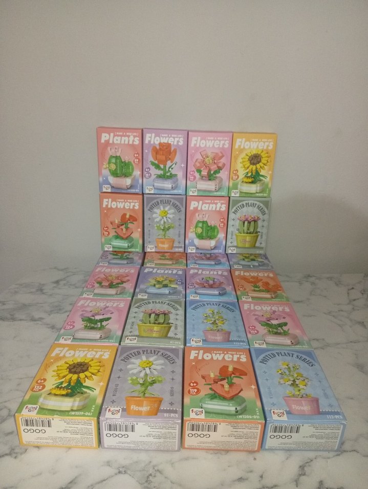 Pastel renklerde, çeşitli çiçek ve bitki tasarımlarını içeren çoklu Lego setleri. Her set, yumuşak tonlarda farklı çiçek ve bitki modelleri oluşturmayı sağlar.
