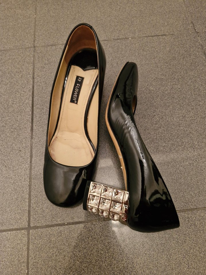Siyah parlak yılan desenli stilettolar, tokalı blok topuklu, klasik zarafet ve gotik tarzı ofis için birleştirir.