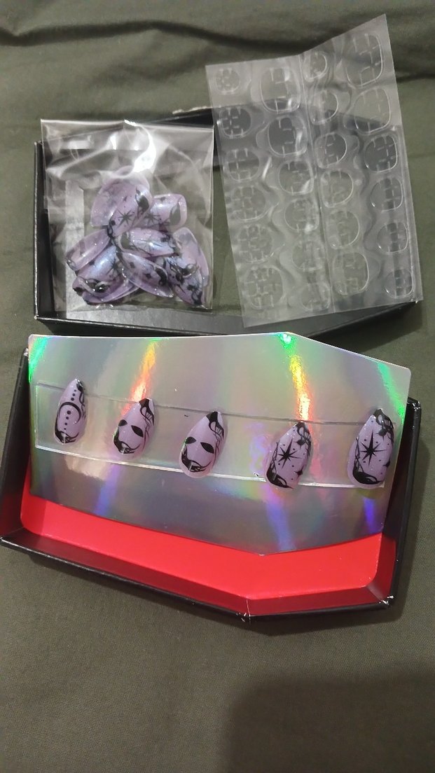 Bu tırnak süsleri, mor taban üzerine siyah desenlerle çok renkli koyu bir tasarıma sahiptir, tırnak sanatını tamamlar.