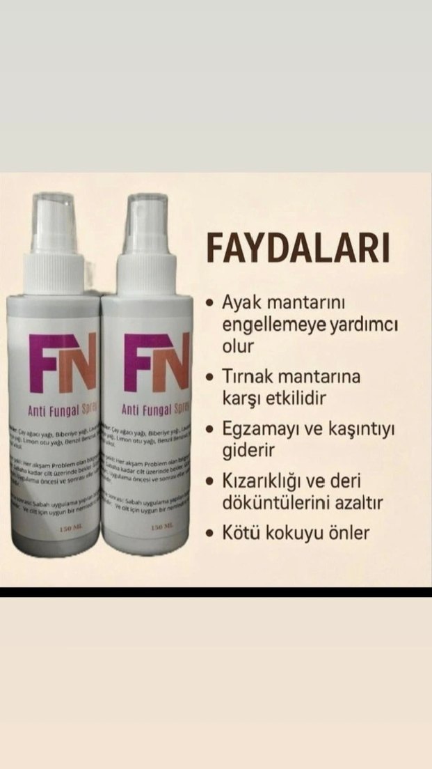 FNFN Anti Fungal Sprey, ayak ve tırnak mantarına karşı etkilidir. Egzama, kaşıntı, kızarıklık ve deri döküntülerini azaltır, kötü kokuyu önler.