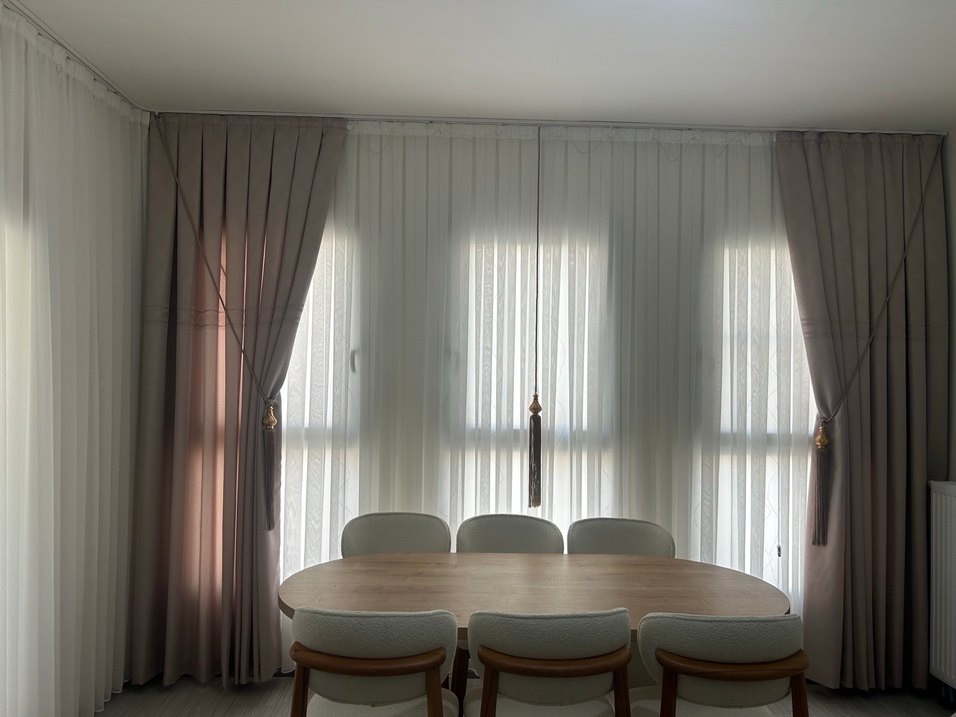 Gri ve beyaz renklerde, desen içermeyen modern tül perdeler. Hafifçe ışık geçirir, odada sakin bir atmosfer yaratır.