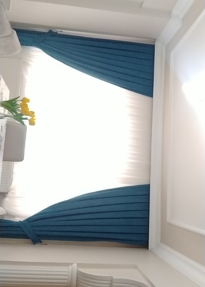 Yeni daha yıkanmadı bile 4 adet fon perde 4 adet aynı renk kırlent kılıfı ve 2 adet dikdörtgen yastık kılıfı renk koyu mavi en 80 cm boy 250 cm