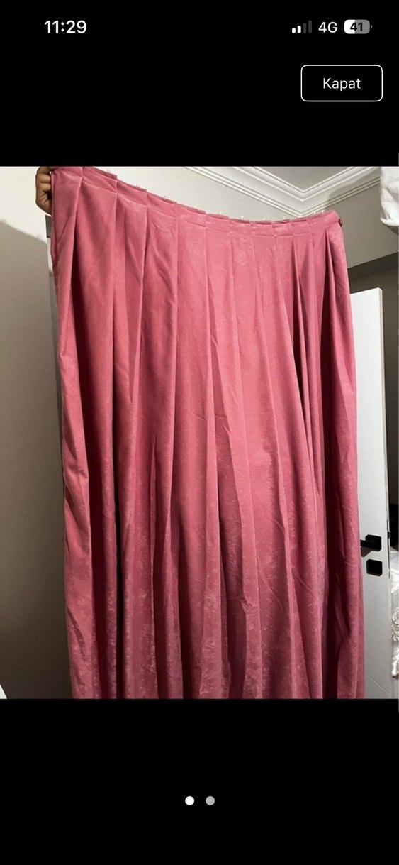 Bazanın altında katlı şekilde durduğundan biraz buruşmuş 4 adet vardır iki pencerelik gül kurusu rengi. boyları 250-260cm arası. Eni 103-113-101-98 cm.