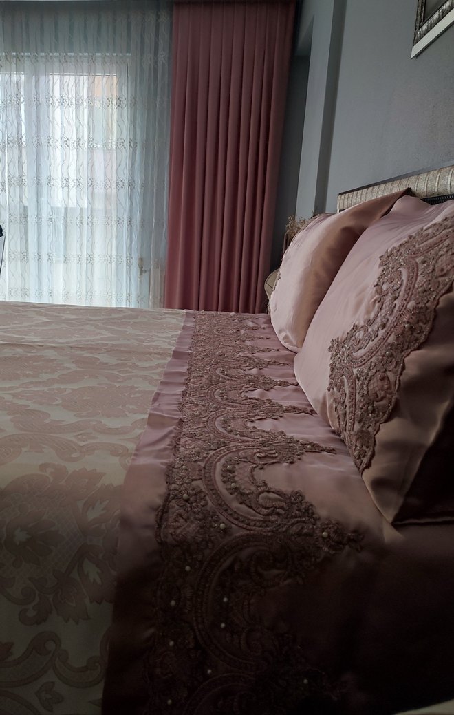 Parlak pembe renkli, detaylı işlemeli yatak örtüsü, yatak odasına zarif ve yumuşak bir dokunuş sağlar. Fon Perde