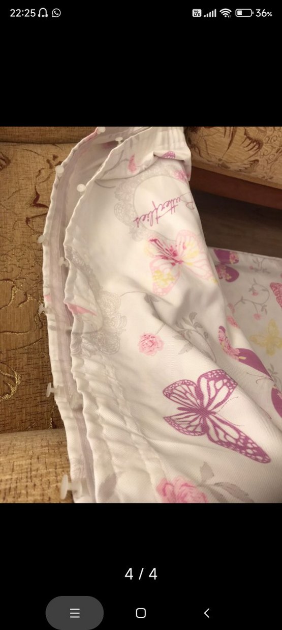 Yumuşak sentetik kumaştan yapılmış, pastel pembe kelebek desenli fon perde. 2 adet var. bir her bir tanesi boyu 260 cm. eni 105 cm. kedimiz perdeye tırmandığı için bazı yerlerinde tırmık izleri olabilir. ama ütüyle belki düzeltilebilir bilemiyorum.