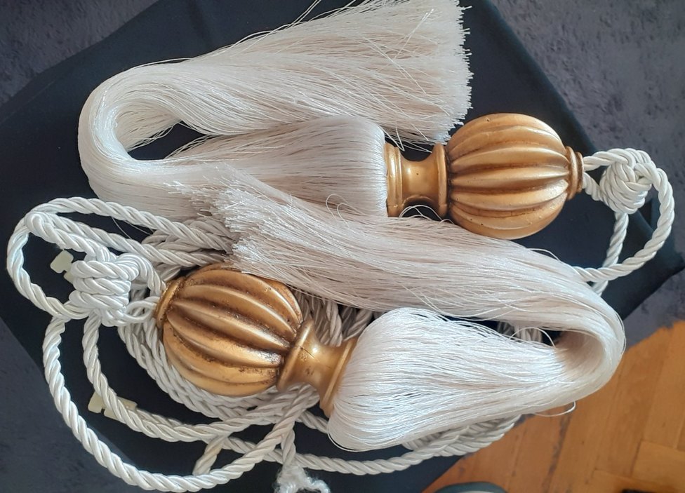 Fon Perde Tavan Bağlama Püsküllü 2'li Braçol Set.Cizgili altın sarısı renkte vazo tavan model braçol.