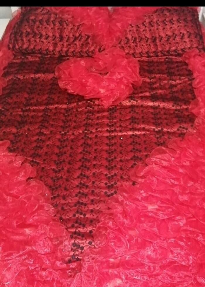 İyi durumda kırmızı siyah fon perdesi ile yatak örtüsü eni 2,85 m uzunluk 2,500mtre