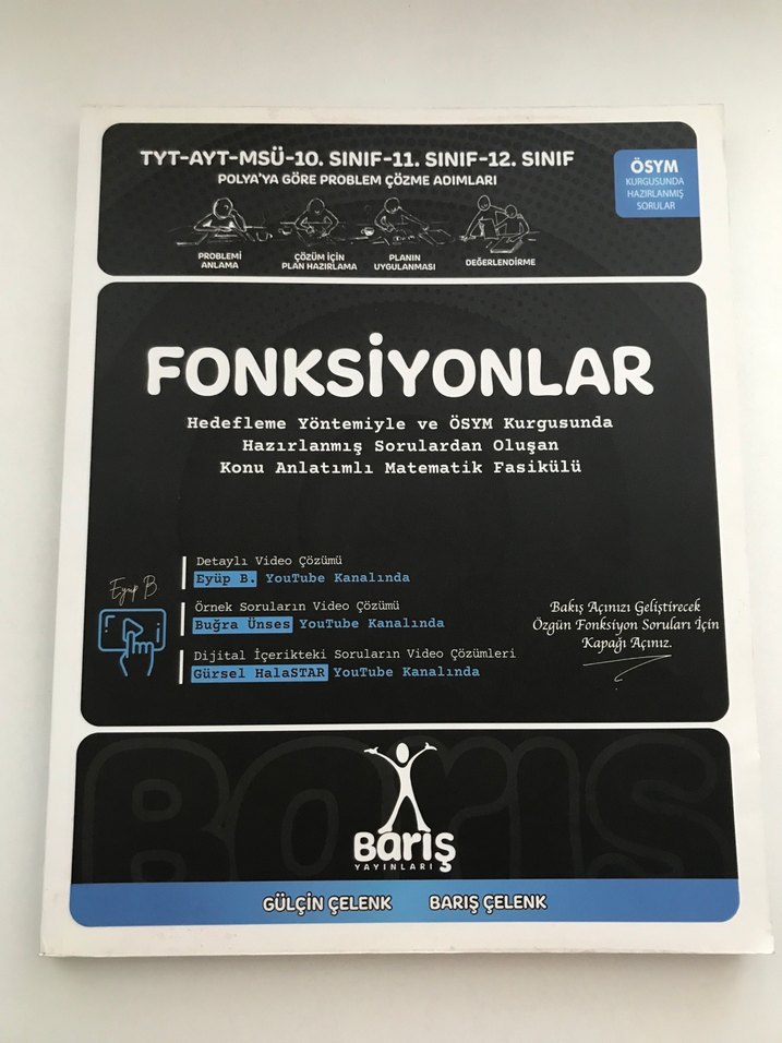 TYT, AYT, MSÜ 10-12. sınıflar için fonksiyonlar konulu, hedefleme yöntemi ve ÖSYM kurgusuyla hazırlanmış matematik fasikülü. YouTube'da detaylı video çözümleri içerir. cok az cozulmus