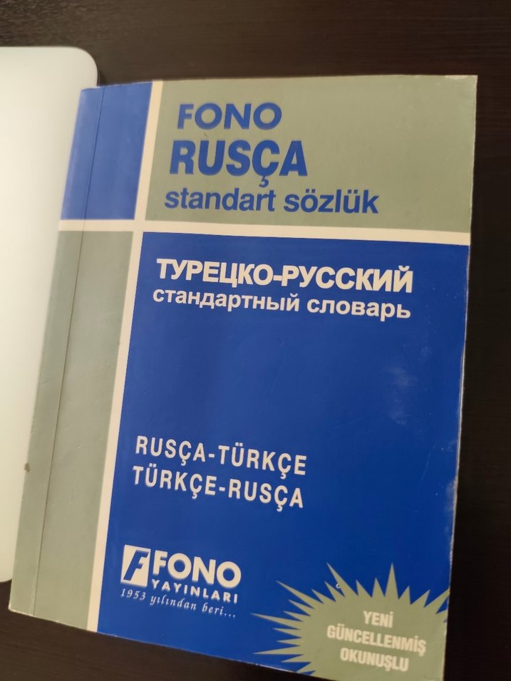 FONO Rusça-Türkçe standart sözlük, güncellenmiş okunuşlu ve çift yönlü çeviriler içerir. 1955'ten beri FONO yayınları tarafından basılmıştır.
