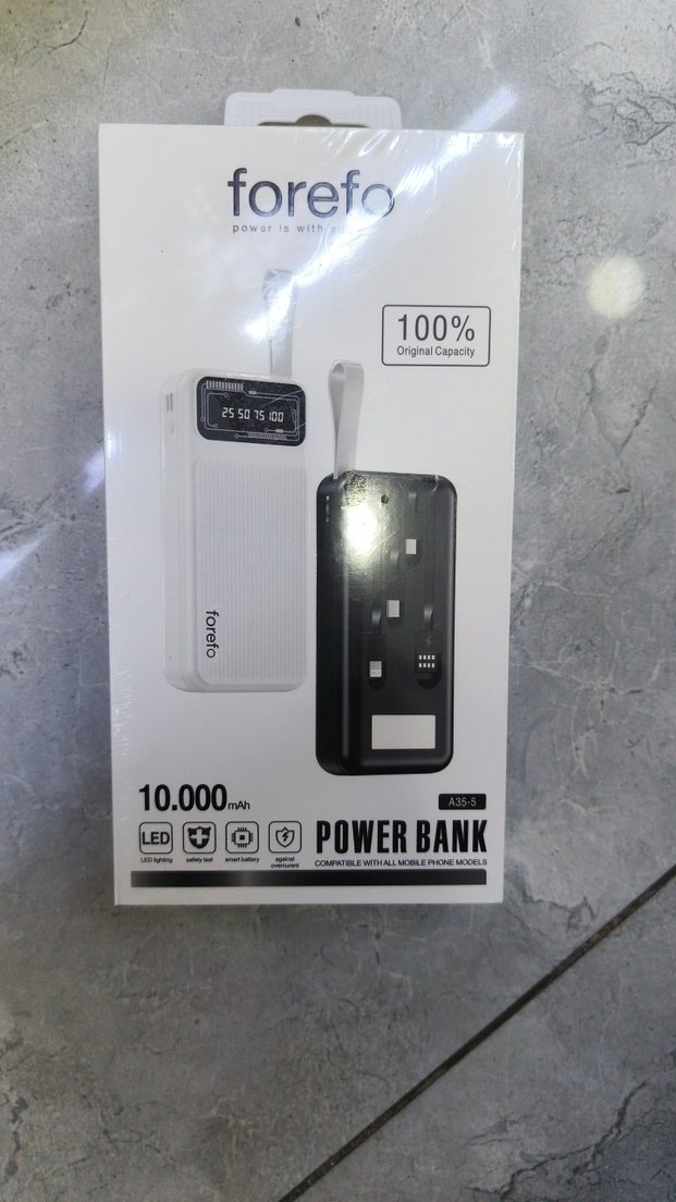 Forefo 10.000 mAh kapasite, LED ekran ve çoklu koruma özelliklerine sahip beyaz power bank. Çeşitli telefon modelleriyle uyumludur. ⚡