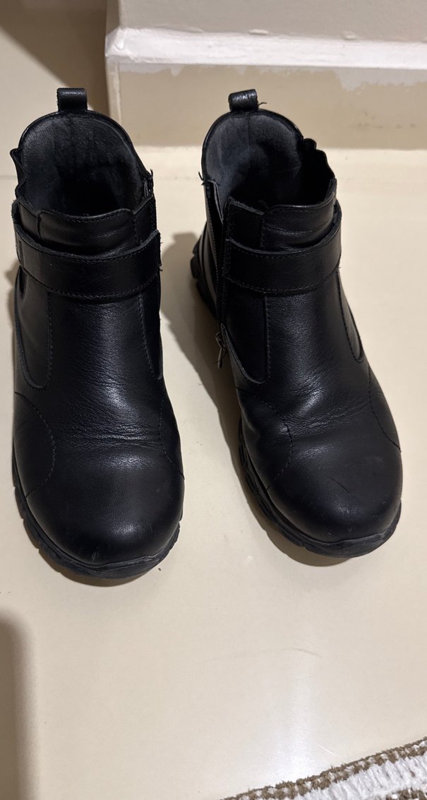 Siyah hakiki deri, tokalı, blok topuklu kadın botu, minimalist goth tarzında, günlük kullanım için uygundur.
