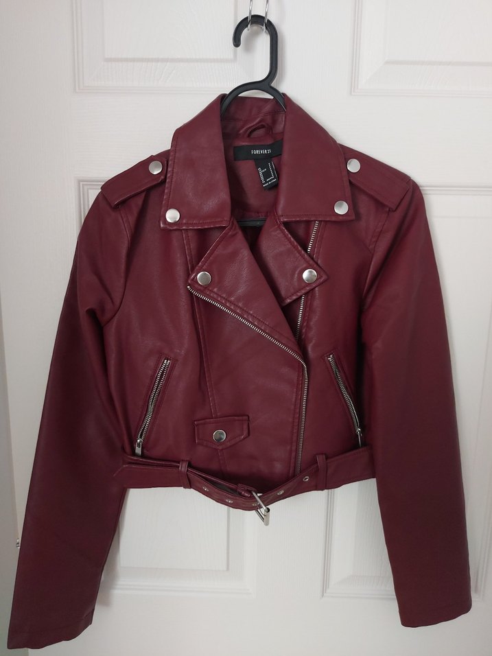 Bordo renk, kemerli ve fermuarlı cepli, yaka detaylı, dar kesim deri biker ceket. Çok az kullanıldı.