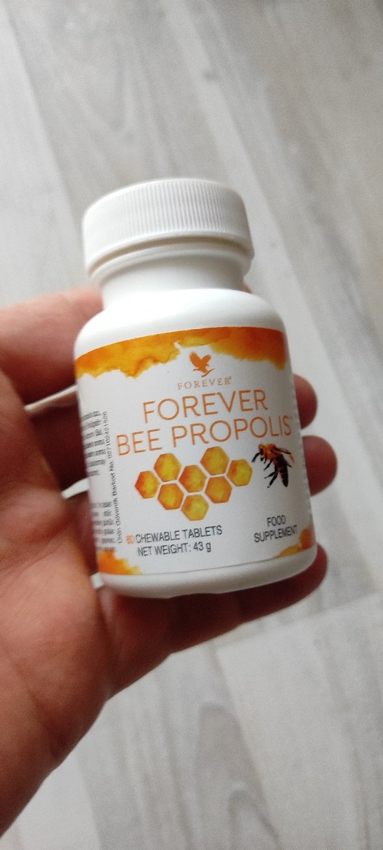 Forever Bee Propolis çiğnenebilir tabletler, 43g ağırlığında şişede sunulur. Turuncu renkteki bu tabletler bir gıda takviyesidir.