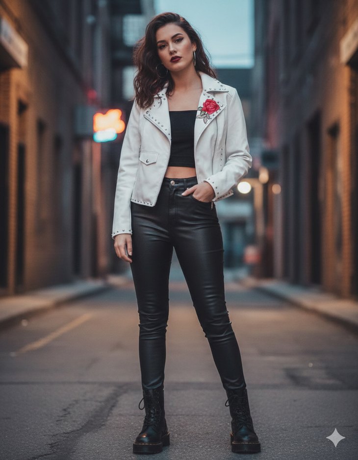 Beyaz deri, kemerli ve uzun kollu, notched lapel yakalı kadın ceketi. Günlük sokak stili için uygun. Bu beyaz, gül işlemeli ve zımbalı deri ceket hem asi hem de oldukça şık bir parça.Herhangi bir deformesi yoktur.Yumuşacık deridir.Yakaları nakış işleme detaylıdır.#forever new