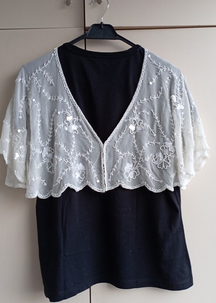 Forever New marka, ekru renkli, komple boncuk ve pul işlemeli, krep kumaş abiye etol. Omuzdan itibaren 36 cm boy. Kopça kapamalıdır. Hiç kullanılmamıştır.