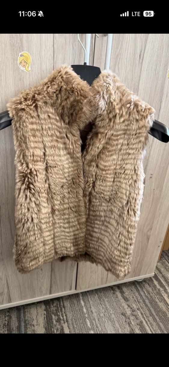 Kahverengi, kürklü, kolsuz ve vücuda oturan yelek. Yüksek yakalı, rahat sentetik kumaşlı ve hafif zebra desenli, dış mekan kullanımı için uygun.