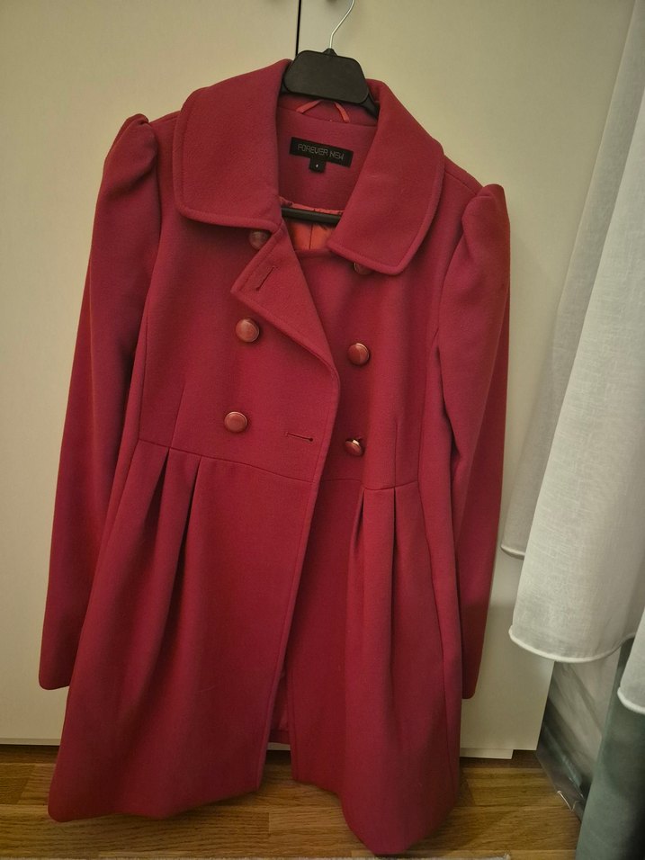 Düğmeli ve geniş yakalı kırmızı kadın kaban, temiz ve sorunsuz