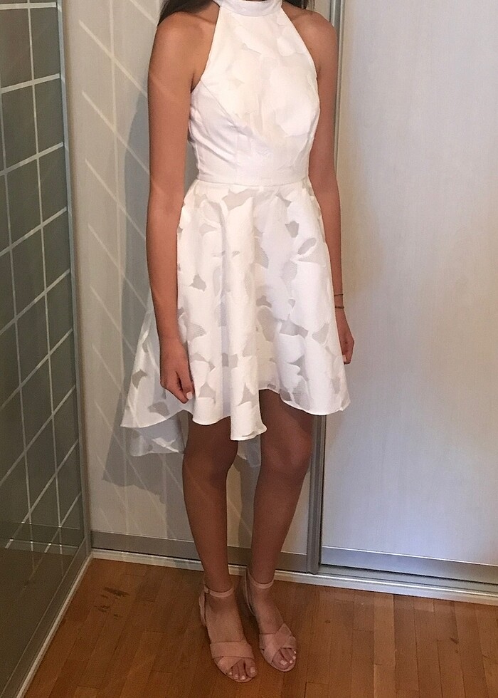 Beyaz, dantel detaylı, etek önü diz üstü, arkası uzun, kolsuz elbise