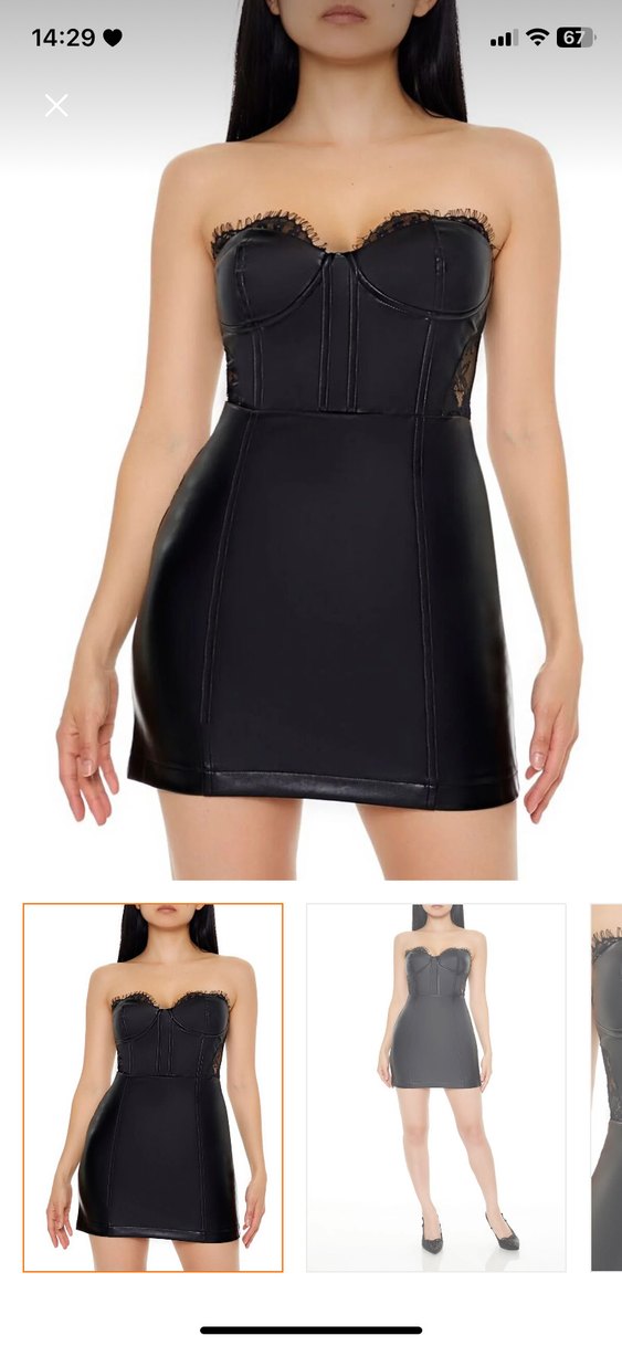 Siyah deri mini elbise, straplez yaka ve ince askılarla. Belden kuşaklı, fit kesim, gotik tarzda romantik akşamlar için uygun. etiketli ürün sadece denedim olmadı bana
