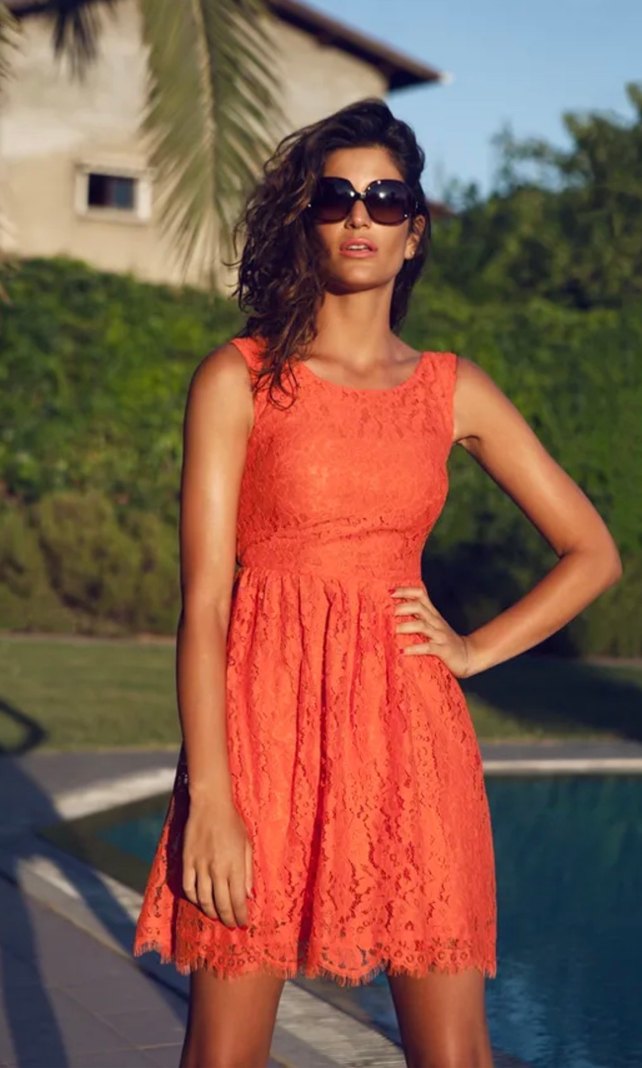 Turuncu renkte, dantel kumaştan yapılmış, V yakalı ve kolsuz, bohem tarzda, normal boy midi elbise, dış mekan kullanımı için uygun.