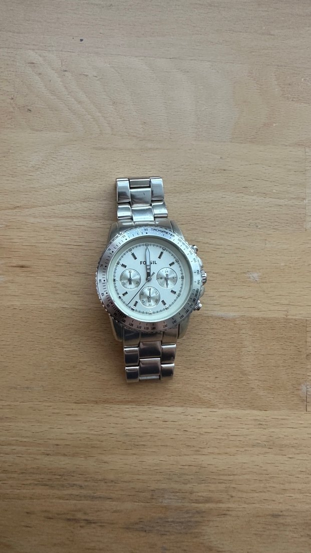 Fossil kadın kol saati, beyaz kadranlı ve üç alt kadranlıdır. Pilinin değiştirilmesi gerekli ve şuan ayarlı değil ama normalde düzgün çalışıyor. Saatin biraz iri bir yapısı var o yüzden aslında unisex olarak kullanılabilir.